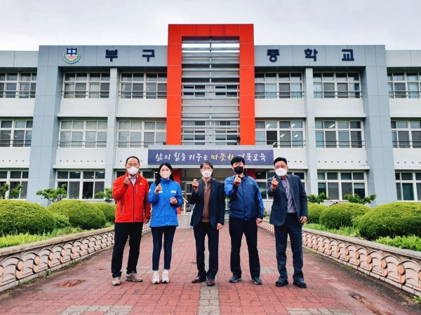 울진군청 방문에 이어서 경북 울진군 북면에 위치한 부구중학교를 방문하여 손홍식 교장님을 예방하고 현재 햇살마루에서 전국적으로 시행하고 있는 클로바 램프 전달에 대한 세부적인 내용을 설명하는 자리를 가졌습니다.