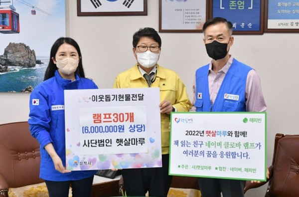 4월 29일 사단법인 햇살마루는 산불로 인한 피해지역인 삼척시에 교육을 보조할 수 있는 책 읽어주는 친구 "네이버 클로바 램프" 전달 차 삼척시청에서 심원섭 부시장님과 간담회 시간을 가졌습니다. 삼척지역아동센터, 다문화 가족 등 가정의 달에 학습 도움이 되어줄 수 있는 클로바 램프를 삼척시에 전달하였습니다.